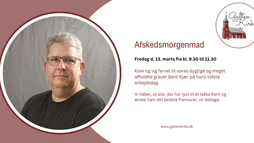 Da vores dygtige og meget afholdte graver, Bent Kjær, flytter fra byen og har fundet nyt arbejde, afholder vi afskedsmorgenmad i sognegården på hans sidste arbejdsdag.